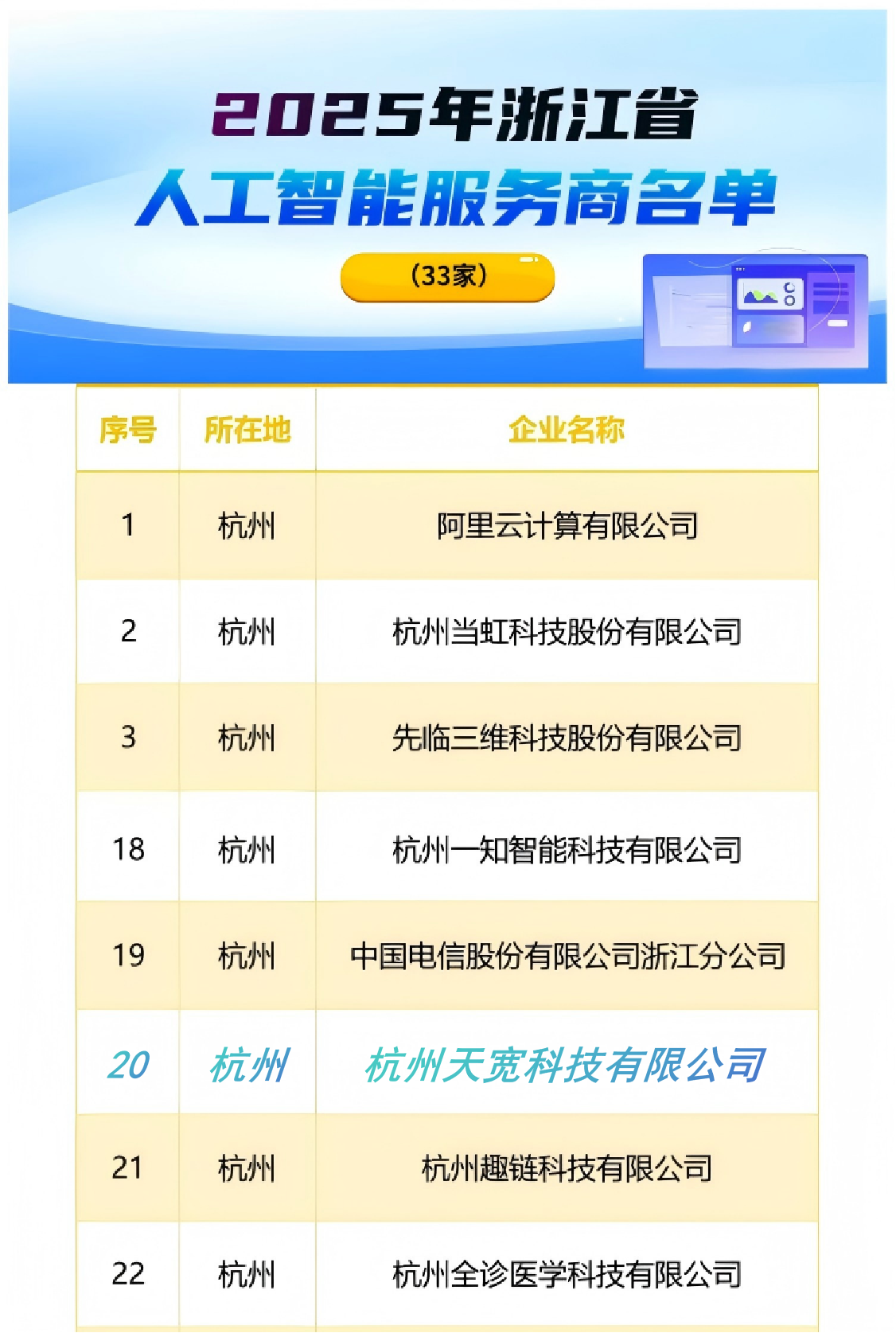 10月11日,浙江省經(jīng)信廳正式公布了《2025年浙江省人工智能應(yīng)用場景、應(yīng)用標(biāo)桿企業(yè)、人工智能服務(wù)商及“數(shù)智優(yōu)品”》遴選結(jié)果。經(jīng)過嚴(yán)格評審程序,天寬科技憑借在人工智能技術(shù)研發(fā)、場景落地與綜合服務(wù)能力方面的突出優(yōu)勢,成功獲評“浙江省人工智能服務(wù)商”。